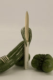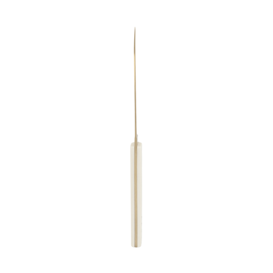 The intersection of form and function, these knives are a study in sleek, minimalist design. Crafted from high-grade, 15CrMoV steel, each blade is titanium coated in a rich Champagne Gold finish. The substantial Ivory handles provide a confident grip, while the signature four dot steel embellishments function as counter-weight for the perfect balance in the hand.