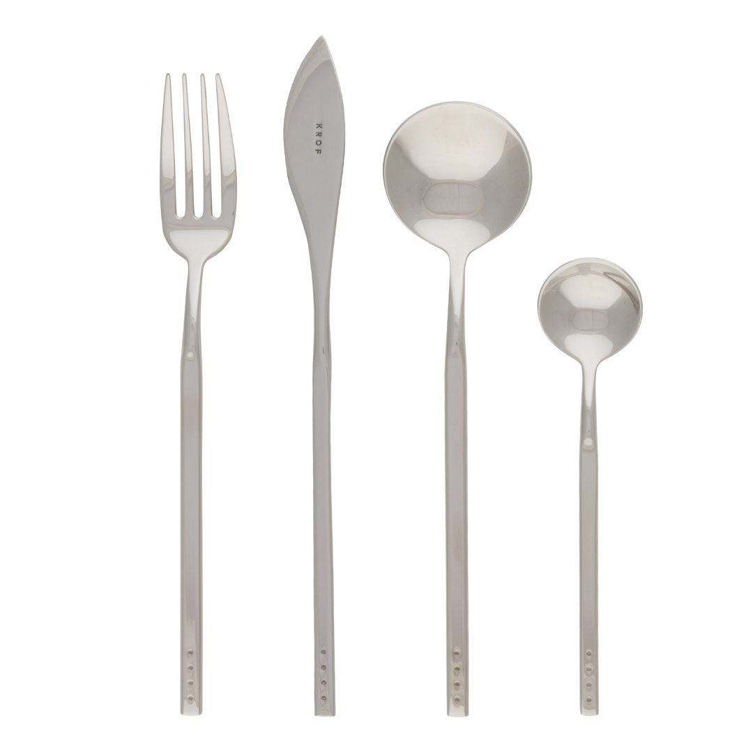 The 8 piece Polished Silver set is for the classic purist. Made from high-grade, dishwasher safe 18/10 hand polished stainless steel and feature the signature four dot logo.